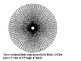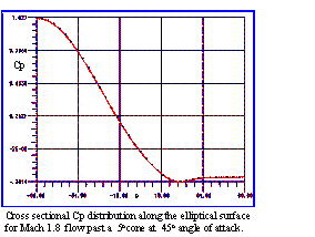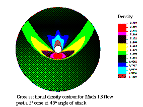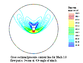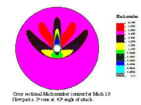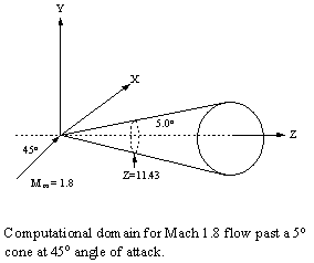Problem: Mach 1.8 flow past a 5o cone at 45o angle of attack.