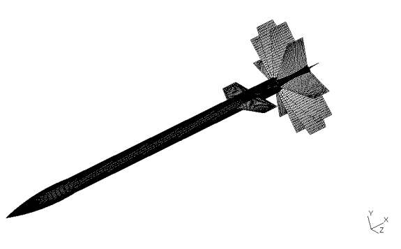 Problem: Mach 0.95 flows past a wing-tails rocket at 5 degrees angle of attack.